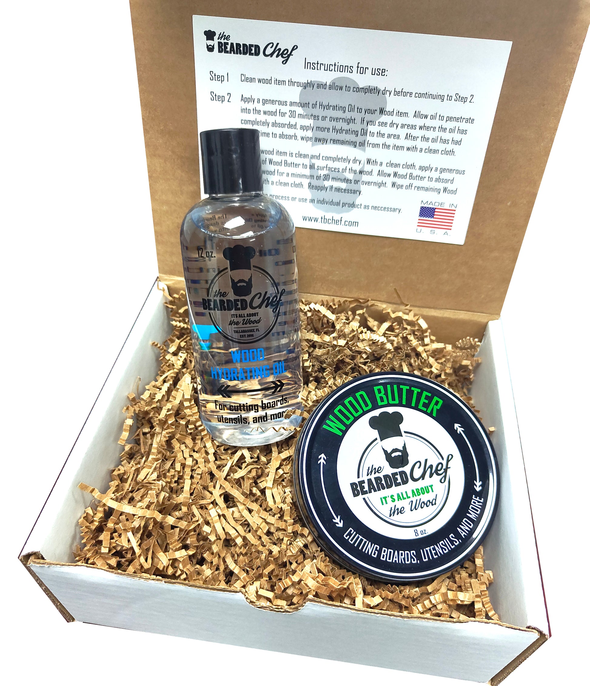 The Bearded Chef Oil & Wood Butter Combo offers two products to hydrate and protect wooden items. The Bearded Chef Hydrating Oil penetrates deep into butcher blocks, cutting boards to hydrate and protect from drying and cracking. Perfect for enriching and protecting your butcher block, cutting board, wood utensils, and more. The Bearded Chef Wood Butter completes your butcher block, cutting board, and wood item restoration by holding in moisture to prevent drying and cracking. The butter is made with food grade mineral oil plus the power of beeswax to protect your wooden boards and utensils. The butter and oil are infused with essential oils to keep wooden items fresh and clean. Combo includes: 1 - 12 ounce wood Hydrating Oil 1 - 8 ounce Wood Butter.